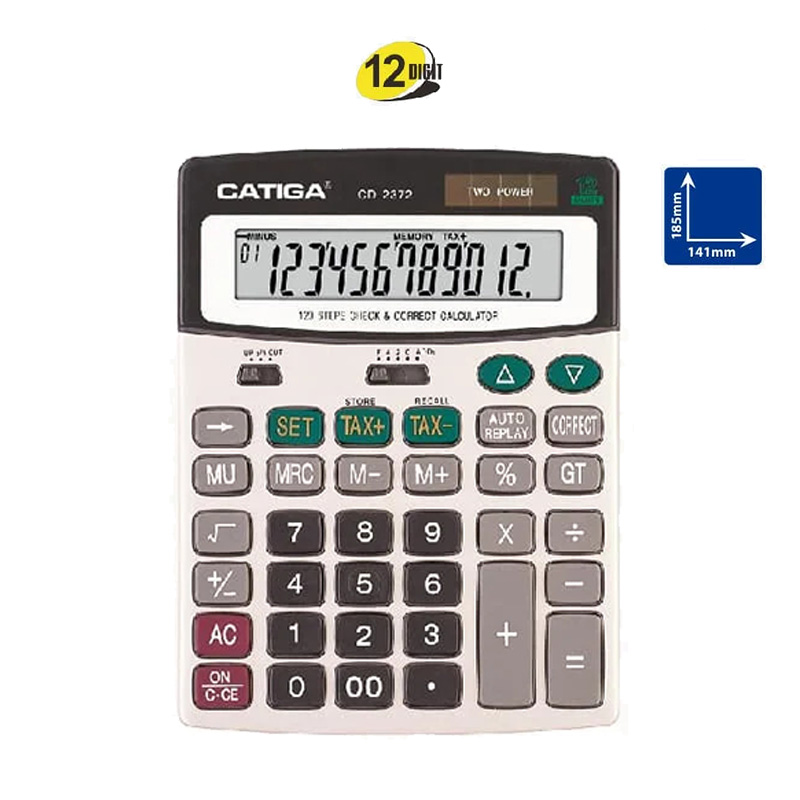 Calculatrice de bureau 12 Digits CATIGA 2372, dimensions 14.10cm de large sur 18.50cm de long.